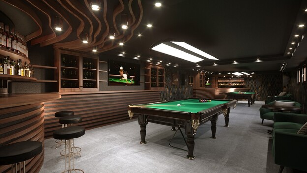 Salon bilardowy w połączeniu z barem w piwnicy. Duża powierzchnia, bo aż 41m2 na jedno pomieszczenie. Na jednej ze ścian lustro, by optycznie powiększyć przestrzeń, przez co wydaje się, że mamy dwa stoły bilardowe ;) Projekt w trakcie realizacji.