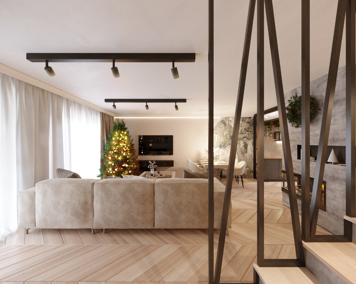 Nowocześnie i przytulnie zarazem. Wizualizacja salonu połączonego z kuchnią, która poprzez szklane przejście z ozdobnymi ramami tworzy odseparowaną część.
